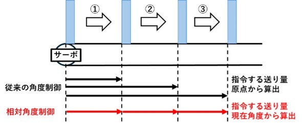 制御機能も強化した。原点から指令角度を算出する従来制御だけでなく、現在角度から算出する「相対角度制御」を実装。動かしたい角度を直接指定すると、直感的な動作が可能になる。