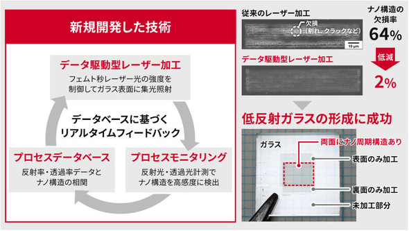 産業技術総合研究所は2025年3月24日、レーザー加工により、ガラス表面に低欠損でナノメートルサイズの周期構造を形成するデータ駆動型レーザー加工技術を開発したと発表した。東京農工大学との共同研究による成果で、低反射などの機能を必要な部分に付与した光学部品などの製造につながることが期待される。