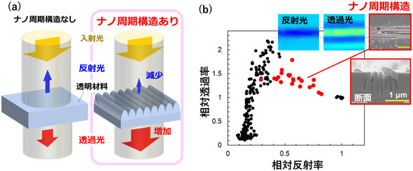 今回の研究では、レーザー加工中のナノ周期構造形成の検出対象として、光の波長以下の大きさのナノ周期構造に着目。このナノ周期構造がガラス表面にある場合、表面の反射率は低減して透過率が増加するが、この現象をモニタリングした。