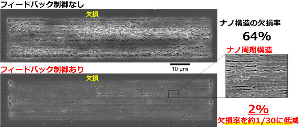 次に、フェムト秒レーザーパルスの強度をフィードバック制御し、相対反射率と相対透過率が任意のナノ周期構造を形成する値となるよう調整した。1ライン照射領域内(長さ1mm)でのナノ周期構造の欠損率は2.4%で、制御しない場合の約10分の1に低減できた。横100μm、縦20μmの領域をレーザー加工した場合では、制御時のナノ周期構造の欠損率は約2%で、制御しない場合の約30分の1だった。これにより、光の透過率が大きい低反射ガラスの形成に成功した。
