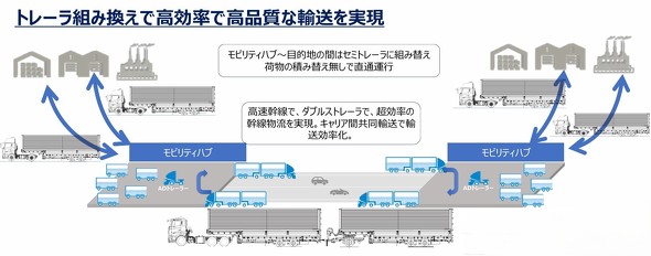 4社が描く自動運転車×共同輸送の姿は次のようなものだ。まず、高速道路付近に「モビリティハブ」を設置し、出発地から一般道で集められた荷物や、高速道路を降りて一般道で目的地に向かう荷物を集約する。荷物と車両を事前にマッチングさせておき、その計画に基づいて自動運転トラックがモビリティハブの間を高頻度で往復して荷物を運ぶ。自動運転トラックは、1台に複数の荷主の荷物を載せる共同輸送や、トレーラーを連結するダブルストレーラーとすることで効率を高める。