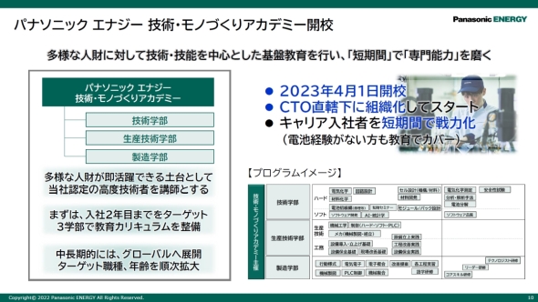 パナソニックエナジーは社内教育制度である「パナソニック エナジー 技術・モノづくりアカデミー」を2023年4月1日に発足させている。CTOの渡邊氏直轄の組織であり、入社2年目までの社員を対象に、同社認定の高度技術者が「技術学部」「生産技術学部」「製造学部」の3学部で電池に特化した技術教育を行う。