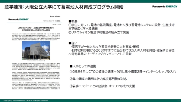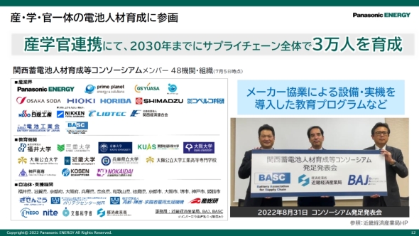 2022年8月には、パナソニックエナジーなど産業界、京都大学大阪大学などの教育機関、自治体などが参加して関西蓄電池人材育成等コンソーシアムが発足した。現在までに48の機関と組織が参加しており、メーカー協業による設備/実機を導入した教育プログラムの立ち上げを計画している。政府は、2030年までに電池産業に関わるサプライチェーン全体で合計約3万人の蓄電池人材の育成を目指しており、同コンソーシアムによる教育プログラムの貢献が期待されている。パナソニックエナジーの果たすべき役割も大きい。