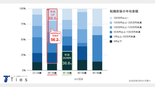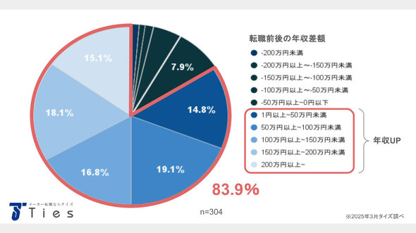 メーカー専門の転職エージェントであるタイズは2025年3月31日、「転職前後の年収変動」についての調査結果を発表した。