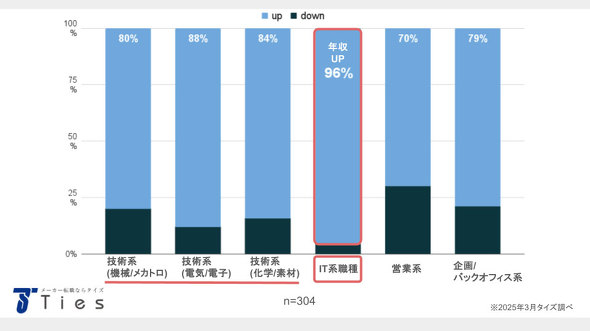 タイズが「転職前後の年収変動」についての調査結果を発表した。製造業への転職で全体の83.9%は年収が増加していた。転職で年収が上がりやすいのは「30〜34歳」で、「IT系職」は96%が年収アップしていた。