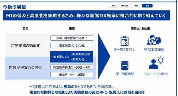 定常業務を効率化する「実験/測定作業の自動化」「測定装置のオンライン化」、新製品提案力を強化する「新規案件探索ワークフロー構築」「知識データベース構築」など、さまざまな開発DX施策によって開発業務全体のデジタル化を進め、活用しやすいデータを自動で蓄積できる仕組みをつくることで間接的にMIの効果を最大化し、最終的な目標である実験業務の高効率化/脱属人化の達成を目指していきたい。