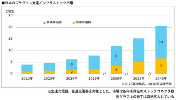 富士経済は、日本、中国、米国など17カ国におけるEV/PHEVの充電インフラ普及動向を調査し、その結果を発表した。2040年の日本における充電インフラのストック市場は、2024年比で3倍に拡大すると見込まれている。