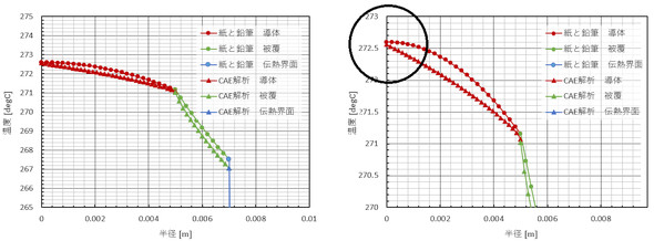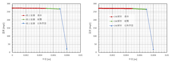 図6左図の赤色プロット(紙と鉛筆 導体)は式14によるもので、緑色プロット(紙と鉛筆 被覆)は式28によるものです。両者が一致していることは分かりますが、導体内部の温度分布を詳しく見ましょう。