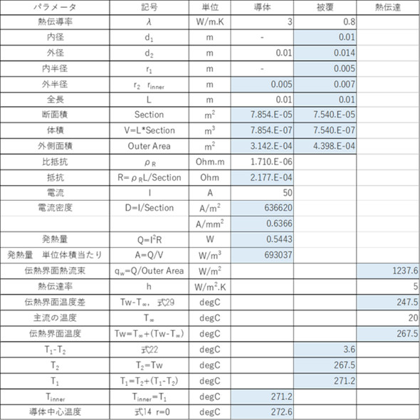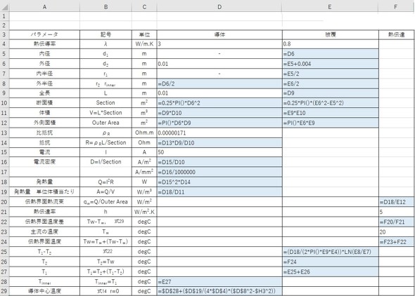 表1と表2に数値代入例を示します。銅の熱伝導率は384[W/(m.K)]ですが、導体内部の温度分布を見るために、導体の熱伝導率を3[W/(m.K)]にしています。着色したセルには計算式が入っています。表1の値を「紙と鉛筆による計算結果」と呼びます。