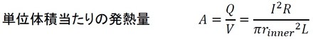 導体の発熱量と単位体積当たりの発熱量は次式で計算します(式31、式32)。