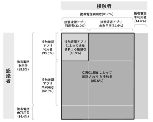 日本における各種データを用いて、BLE方式とCIRCLE方式の感度や特異度を比較したところ、CIRCLE方式はBLE方式の最大7倍以上の感度を持つことが分かった。BLE方式はアプリ利用者のみが対象となるため、接触検知性能の指標となる感度が低くなることが原因と考えらえる。