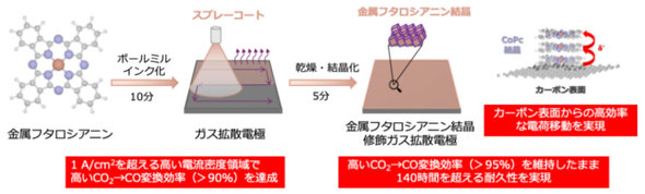 研究では、CO2電解還元反応によるCO2からCOへの変換を効率化するため、顔料の1種で金属錯体のコバルトフタロシアニン(CoPc)に着目。CoPcや無金属フタロシアニン(H2Pc)、銅フタロシアニン(CuPc)、鉄フタロシアニン(FePc)などの溶液をガス拡散電極上にスプレー塗布し、フタロシアニン類を直接結晶化してCO2電解用の電極を作製した。
