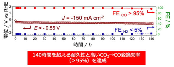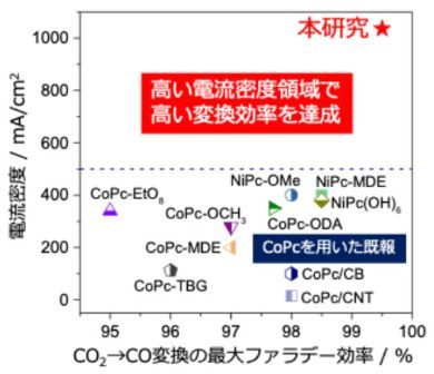 作製した電極を正極として、アルカリ電解質中でCO2電解還元反応を実施したところ、CoPcが最も効率的にCO2からCOへ変換できた。CoPcは、実用に十分な1.034A/cm2の高い電流密度で90%以上のファラデー効率(FE)でCOに変換できた。また、電流密度150mA/cm2における耐久性試験では、143時間にわたって95%以上の変換効率を維持した。