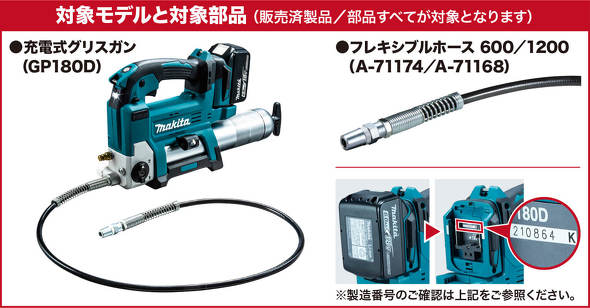 マキタは、電動工具の「充電式グリスガン GP180D」および「フレキシブルホース600/1200」(販売期間:2021年4月〜2025年1月)について、「ホース先端部分を曲げて狭い場所にグリスを注入する作業を繰り返すことで、ホースの先端付近に穴が開き、グリスが噴出する恐れがある」とし、2025年3月13日に使用中止と対策部品(グリス噴出防止対応ホース)への無償交換を発表した。リコール対象数は1万9082台で、交換対応は同年3月21日から開始している。