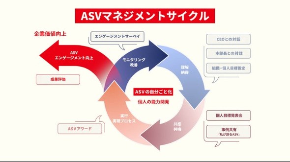 実際に、このサイクルを回して理念浸透を実現しているのが味の素グループです。同社は「事業を通じて社会価値と経済価値を共創する取り組み」を「ASV(Ajinomoto Group Creating Shared Value)」と称し、経営の基本方針としています。このASVを従業員が「自分ごと化」し、実践できるようにするために「ASVマネジメントサイクル」という仕組みを構築し、各ステップでさまざまな施策を講じています。施策の詳細は、味の素グループのWebサイトをご覧いただければと思います。