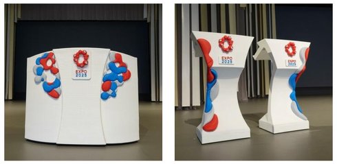 EXPOナショナルデーホールで使用される演台および司会者台は、3Dプリンタで製作されている。建設現場から回収したPP(ポリプロピレン)バンドを再資源化し、材料として活用した。手掛けたのは鴻池組とスワニーだ(詳細はこちら)。