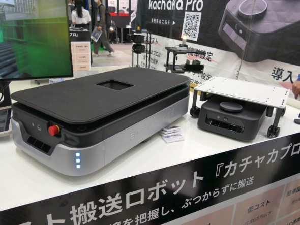 Preferred Roboticsが披露した100kgの重量物搬送に対応する業務用搬送ロボットの新モデル(左)。「カチャプロ」(右)と比べて可搬重量が3倍以上になることもあり大型になっている。今回はモックアップ展示のみで、動作はしていなかった[クリックで拡大]カチャカプロは、100万円以下という低価格で導入可能な小型搬送ロボットだ。2023年2月発表の家庭用自律移動ロボット「カチャカ」を基に、法人向けに機能とサービスを強化した。けん引力は最大30kg(フローリング床走行時)で、検出距離12mのLiDAR(Light Detection and Ranging、ライダー)を搭載し、SLAM(Simultaneous Localization and Mapping)方式で広い現場を自律移動できる。