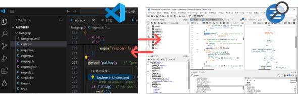 Understand 7.0は、MicrosoftのVisual Studio Code(VS Code)との連携に対応し、VS CodeとUnderstandの双方向から該当のファイルや関数にジャンプできる。VS CodeからUnderstandにジャンプした先で、ファイルや関数、変数に関連する情報、メトリクス、グラフを確認したり、Understandの解析コマンドを実行できる。