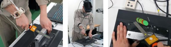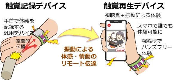 東北大学は、リアルな触覚を再現するAR技能教育システムの開発を担当した。腕輪型の触覚記録デバイスが、作業者が手で感じる振動体感を手先から手首に伝わる振動波形として計測し、触覚の知覚量に基づく信号処理技術で数値化した後、ARシステム経由で空間に投影する。記録した触覚は、腕輪型デバイスに内蔵されたバイブレーターで、忠実に再現できる。