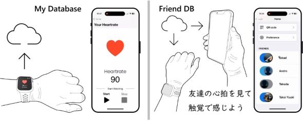 筑波大学は、疑似心拍振動による社会交流促進を実証し、心拍数共有アプリを開発した。開発済みの疑似心拍振動で、覚醒の度合いの表現だけでなく、快、不快の感情を表現できることを実証した。さらに、カメラやウェアラブルデバイスで計測した表情や心拍数などの生体信号を疑似心拍振動を通じて伝達すると、相手の存在感が強まることを確認した。この実験を基に、ゲームの対戦者同士やアスリートとコーチなど二者間で振動を介して心拍数を共有できる心拍数共有アプリを一般公開している。