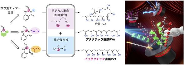 PVAは、医療用材料や偏光フィルム、接着剤など幅広い用途で利用される高分子だ。炭化水素主鎖に水酸基側鎖が直結した構造を持ち、高い親水性、生体適合性、結晶性、分解性などを有する。そのため一次構造を多重制御できれば、水酸基の周辺環境の違いに依存したPVA特性の変化により、高機能化や用途拡大が期待できる。