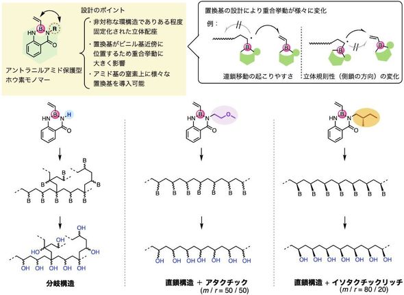 研究グループは、PVAの多重制御を可能にするため、アントラニルアミド基でホウ素を保護したモノマーを設計。ラジカル重合と水酸基化を実施したところ、置換基がない場合は分岐構造を持つPVAが得られた。アミド基上にメトキシエチル基などの置換基を導入した場合では、分岐構造を持たない直鎖PVAが得られた。