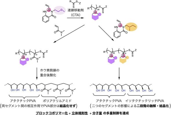 これらのホウ素モノマーは、連鎖移動剤を用いた可逆的付加−開裂連鎖移動(RAFT)機構による制御ラジカル重合にも利用でき、異種モノマーとのブロックコポリマー化を含む多重制御も達成した。例えば、ジメチルアクリルアミドとアタクチックPVAから、ブロック共重合体を合成。また、アタクチックPVAを得られるホウ素モノマーとイソタクチックPVAを得られる別種のホウ素モノマーのブロック共重合とホウ素側鎖変換により、ステレオブロックPVAを合成できた。