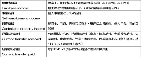 可処分所得 = 雇用者所得 + 事業所得 + 財産所得 + 経常移転給付 - 経常移転負担