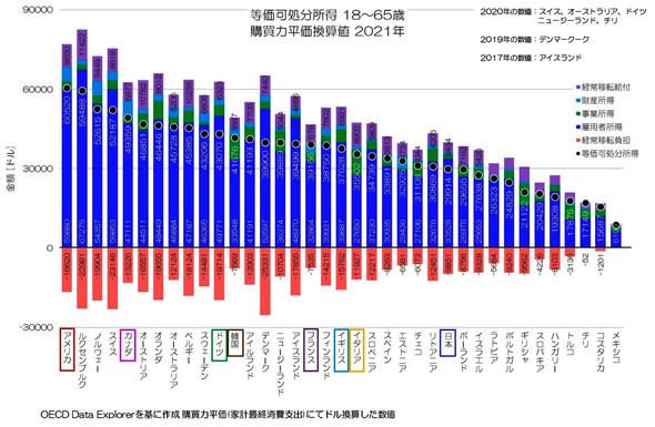 最新のデータで、もう少し詳細の中身を見てみましょう。図2はOECD各国の等価可処分所得について、その内訳まで表現したグラフです。差引の等価可処分所得が高い順に並べています。