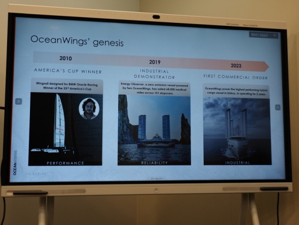 2025年4月10日、OCEANWINGSのCEOを務めるEmmanuel SCHALIT氏が来日し、同社が開発した風力補助推進装置の技術的特徴と、日本市場における展開戦略について紹介した。