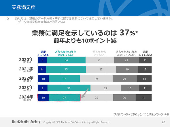 データサイエンティスト協会が「データサイエンティストの実態」に関する調査結果を発表。データサイエンティストの業務満足度は前年比10ポイント減の37%だった。また、生成AIの業務利用が前年から倍増していた。