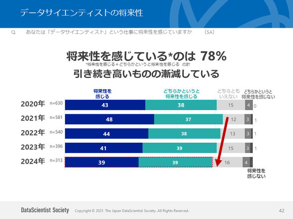 データサイエンティストという仕事に将来性を感じているかについては、「将来性を感じる」「どちらかというと将来性を感じる」がどちらも39%で、78%が将来性を感じていた。しかし、将来性を感じるという回答割合は低下傾向にあり、ここ5年で最も低い結果となっている。