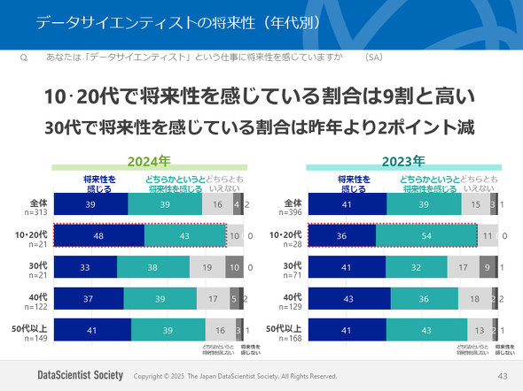 データサイエンティストという仕事に将来性を感じるかについて、年代別に見ると、10、20代は91%が将来性を感じていた。一方、30代は71%と前年より2ポイント減っており、年代差が見られる結果となっている。
