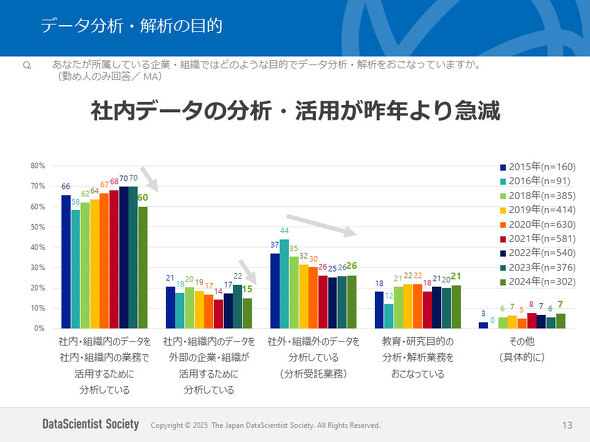 「所属している企業、組織ではどのような目的でデータ分析、解析をおこなっていますか」と尋ねたところ、「社内、組織内のデータを社内、組織内の業務で活用するために分析している」(60%)が最も多かった。しかし、前年から10%減少している。