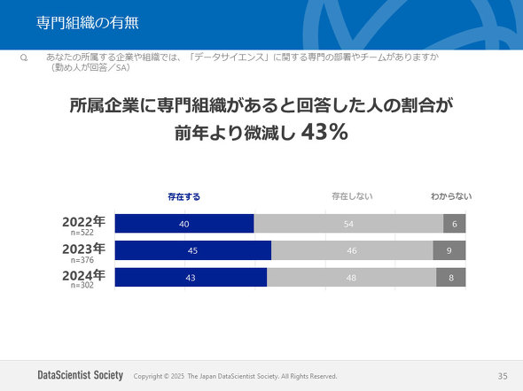 また、所属する企業や組織にデータサイエンスに関する専門の部署やチームがあるかを尋ねた。その結果、「存在する」は43%で、前年比2ポイント減となった。
