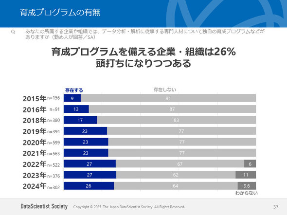 所属する企業や組織に、データ分析、解析に従事する専門人材を独自に育成するプログラムなどがあるかを尋ねると、「存在する」と回答したのは26%だった。2019年以降、20%台が続いており、育成プログラムを整備する組織は頭打ちになりつつある傾向が見られた。
