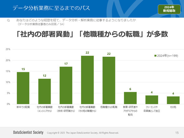 また、どのような経歴を経てデータ分析、解析業務に従事するようになったかを尋ねたところ、1位は同率で「社内の部署異動(その他の職種から)」「他職種からの転職」(22%)、3位が「社内の部署異動(技術、研究職から)」(17%)だった。