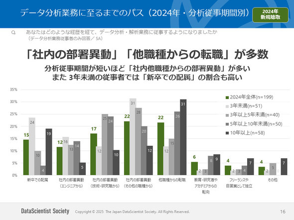 どのような経歴を経てデータ分析、解析業務に従事するようになったかについて、分析従事期間別に見ると、分析業務の従事期間が短いほど「社内の部署異動」が多く、長いほど「他職種からの転職」が多かった。3年未満の従事者を見ると「新卒での配属」の割合も高かった。
