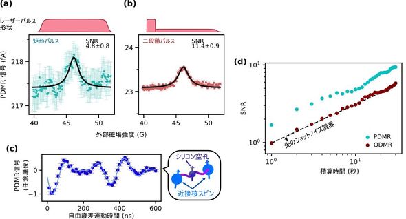 信号対雑音比(SNR)はODMR法の約1.7倍を達成しており、高効率なスピン情報読み出しが可能になった。シミュレーションではSNRを約3倍に改善できる余地が示されており、今後さらなる高効率化を図り、デバイス動作の実証につなげたいとしている。