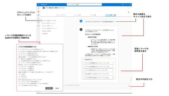 生成AI(人工知能)を活用することで、対象業務やシステムのノウハウを文書から自動抽出し、チャット形式での問い合わせ対応も可能とする。メンバーの理解度を確認する定着度テストも自動生成され、業務に必要な知識の習得状況を可視化できる。