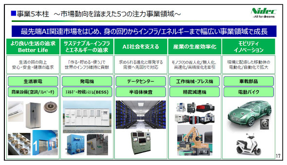 また、新たに商業/家電向けのモーターやファンなどの「より良い生活の追求 Better Life」、BESS(Battery Energy Storage System、バッテリーエネルギー貯蔵システム)を中心とした「サステナブル・インフラとエネルギーの追求」、サーバやデータセンダー向け電源事業で構成される「AI社会を支える」、工作機械、減速機などによる「産業の生産効率化」、車載部品などの「モビリティイノベーション」の5つの事業領域を定めた。それぞれの領域には責任者およびサブリーダーなどを任命し、最先端のAI関連市場からインフラ、生活家電、エネルギーまで幅広い事業領域で成長を図る。
