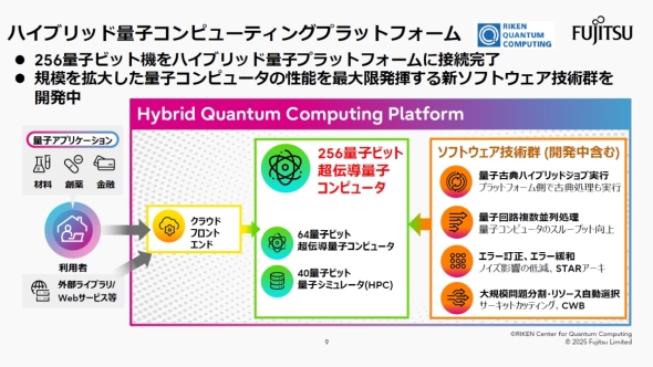 もう1つの意義がアプリケーション開発を含めた利用の促進である。富士通は、2023年に開発した64量子ビットの超伝導量子コンピュータと、同社のスパコンノード「PRIMEHPC FX700」を1024台並べて構成した量子コンピュータシミュレーター(40量子ビット相当)とを連携させた「ハイブリッド量子コンピューティングプラットフォーム」を提供しているが、このプラットフォームに新たに256量子ビットの超伝導量子コンピュータを接続し、2025年度第1四半期中に企業や研究機関に提供を開始する計画である。