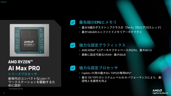 これらのモバイルワークステーション特有の課題を解決するべく登場したのが、2025年1月に日本HPが発表した「HP ZBook Ultra G1a 14 inch Mobile Workstation」だ。最大の特長は、最新プロセッサ「AMD Ryzen AI Max PRO」を搭載した点にある。同プロセッサは、CPUとGPU、そしてAI(人工知能)処理に特化したNPUを1つのチップに統合したSoC(System on Chip)である。CPUは最大16コアで、NPUは最大50TOPSの処理性能を誇る。統合メモリアーキテクチャを採用しており、最大128GBのシステムメモリのうち96GBまでGPU用VRAMとして割り当て可能だ。3D CADツールやレンダリングソフトなど、大容量のVRAMを要求するアプリケーションにおいても、従来の16インチモバイルワークステーション以上のスムーズな処理を実現する。