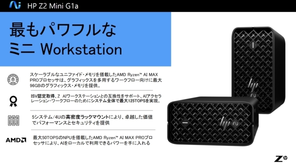 さらに日本HPは2025年夏、AMD Ryzen AI Max PROを搭載した据え置き型のミニワークステーション「HP Z2 Mini G1a Workstation」の発売を予定している。同機は、前述のHP ZBook Ultra G1a 14 inch Mobile Workstationと同等のグラフィックス性能を備え、Copilot+ PCの要件を満たす日本HP初のデスクトップ型ワークステーションとなる。筐体サイズは従来のZ2 Miniシリーズと同様に縦横約20cmのコンパクトな設計を維持しつつ、新たに電源を内蔵した点が大きなポイントだ。これによりACアダプターが不要となり、設置の自由度が大幅に向上。デスク下やモニター背面へのマウントはもちろん、サーバルームにおけるラックマウント運用にも対応する。