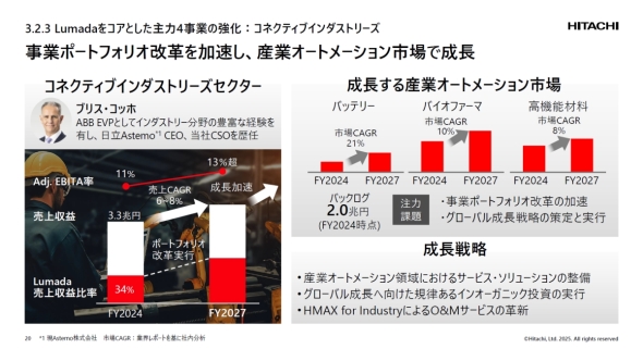 CIセクターのInspire 2027の目標は、売上高の年平均成長率で6〜8%、Adjusted EBITA率の2024年度の11%から13%超への向上となる。徳永氏は「まず、事業ポートフォリオ改革を急ぐ。その上で産業オートメーション事業での成長を目指し、戦略の具体化と実行に取り組む。例えば、ディスクリート(組み立て)系とプロセス系が融合するバッテリー製造、バイオファーマ、高機能材料などの市場は成長が続いている。CIセクターは、産業オートメーション市場でラインビルドを含む自動化/効率化など、フロントラインワーカーの生産性向上につながるサービスの具体化を進める」と説明する。事業ポートフォリオ改革を強調する一方で、インオーガニック投資の実行も施策に盛り込んでおり、中型〜大型のM&Aが行われる可能性もある。