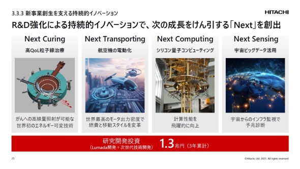 研究開発投資では、Lumada開発と次世代技術開発の3年累計で最大1兆3000億円を投じる。対象となる次世代技術としては、粒子線治療、航空機の電動化、シリコン量子コンピューティング、宇宙ビッグデータ活用などが例として挙がっている。