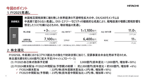 Inspire 2027と併せて発表した2025年度連結業績見通しにおいても、米国の相互関税の影響を一定程度見込んでいる。2025年度連結業績見通しは、売上高が前年度比3%増の10兆1000億円、Adjusted EBITA率が同0.1ポイント減の11.0%※)、当期利益が同15%増の7100億円、コアFCFが同18%減の6400億円。この前提として、米国政府が2025年4月2日に発表した全ての相互関税の税率が適用されたと仮定した上で、米国市場の直接影響のみを想定し織り込んだ。2025年度年間の影響額としては、Adjusted EBITAで300億円、当期利益で350億円を想定している。ただし、米国市場における販売機会損失や他地域の影響については現時点で見通せないため織り込んでいない。