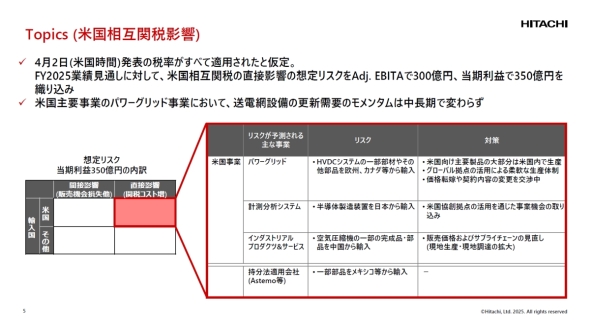 関税政策の影響が最も大きい米国は、日立の2024年度売上高で1兆3000億円となり約13%を占める。徳永氏は「米国の自国優先主義への移行は一過性のものではないと考えている。そこで、グローバル自律分散型経営をよりいっそう推し進めて地産地消を強化し事業リスクの低減に取り組む」と述べる。
