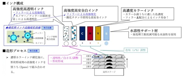 同技術で使用するインクは、独自のフィラーを添加することで大幅な強度向上を図るとともに、インクジェットノズルからの安定した吐出を可能としている。クリアインクとホワイトインクをメインに、高濃度のカラーインクを所定の位置に少量配置することで、高強度とフルカラーを両立させている。