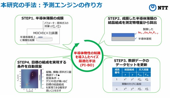 新手法の手順は以下の通り。まず原料ガス量(FGa、FAs)を実験パラメータとして結晶を成膜する。次に、成膜した結晶の測定可能な物理量(バンドギャップ波長と格子定数)により結晶組成を導出。続いて、原料ガス量(FGa、FAs)と結晶組成(x、y)の実験結果を教師データとして成膜ごとに更新する。その後、教師データのセットを、ベイズ最適化と半導体物性の知識を組み合わせた予測エンジンに取り込み、目標の結晶組成を得るための原料ガス量を導き出す。